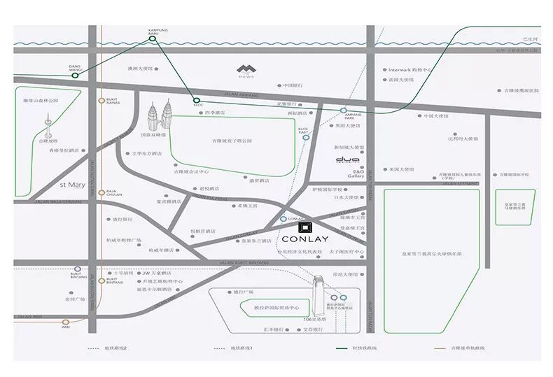 康萊(Conlay)項目位於Jalan Conlay康萊路,吉隆坡市中心。 康萊(Conlay)所在之處一直是吉隆坡社會人士和精英的聚集地。 馬來西亞不少皇室蘇丹也在康萊(Conlay)之處建立王宮,與皇家官邸為鄰,可見此處地點之尊貴。 公寓的對面就是皇家雪蘭莪高爾夫俱樂部,一望無際的綠色景觀為您帶來每一天的好心情! 另外一邊則是雙子塔和星光大道等的繁華地點,讓你充分體會到當地的人文風情