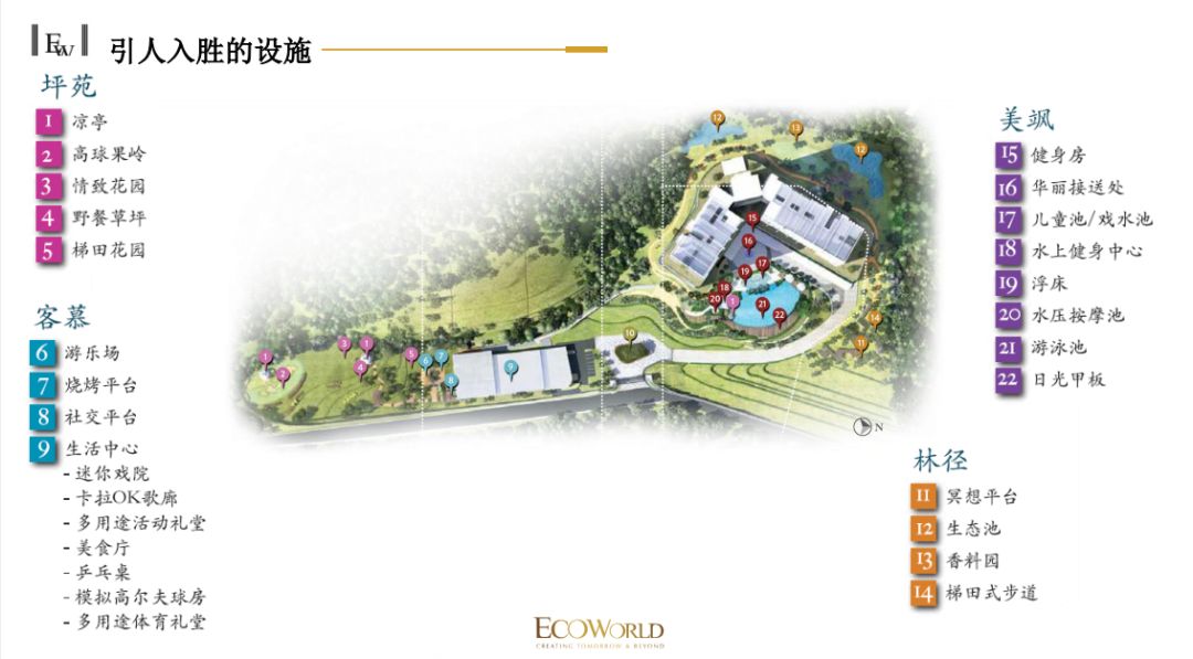 如果想動動筋骨,公寓裡有一間面向泳池,景觀非常佳的健身室,讓運動者可以完全放鬆身心。 各式各樣的健身器材、瑜伽室、室內影院、卡拉ok 房、桌球等都會讓人閒不下來! 座落在大廳前方的泳池設計也設有水上健身器材供使用,同時也延續後山瀑布的景緻,小瀑布分布在泳池一邊。 躺在沙灘椅上過個慵懶的傍晚,有如置身度假勝地。 這僅僅是Eco Terraces的冰山一角。 只要你想動,整個住宅範圍也有跑步道和單車道。 公寓旁有一間多用途禮堂可供宴會租借或進行羽毛球、室內足球、籃球等運動。 這百分之70的地段,也包括在禮堂後方依山坡規劃的草坪和涼亭,這裡可以是不錯的野餐區和燒烤區,更可以是大型的星光室外電影院。